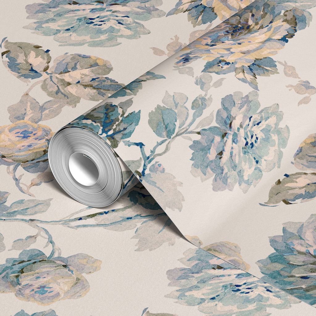 Elegant watercolor floral pattern featuring soft blue blooms against a cream background, perfect for sophisticated home decor.