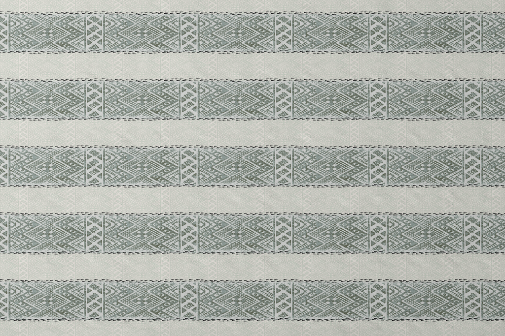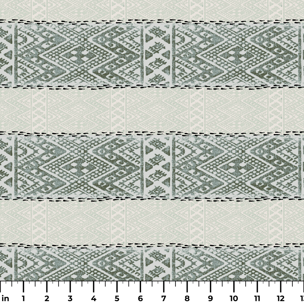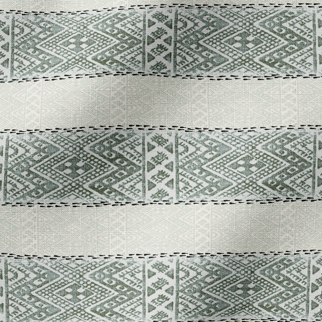 Elegante diseño textil de inspiración étnica con patrón geométrico tradicional en tonos verdes y blancos, perfecto para decoración boho o tribal.