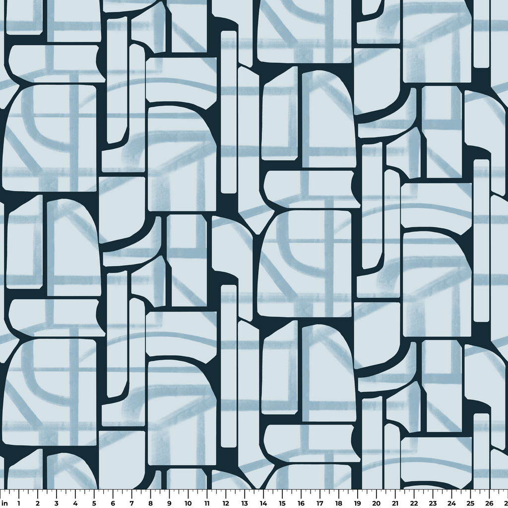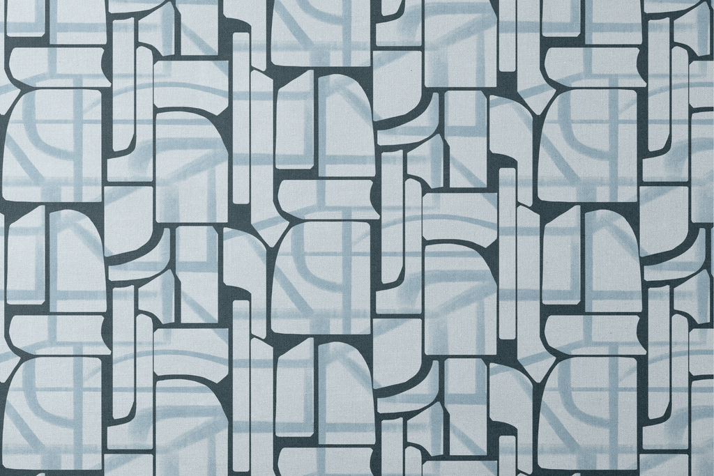 Modern geometric pattern with curved lines and abstract shapes in soft blue and navy tones, creating a contemporary, minimalist aesthetic.