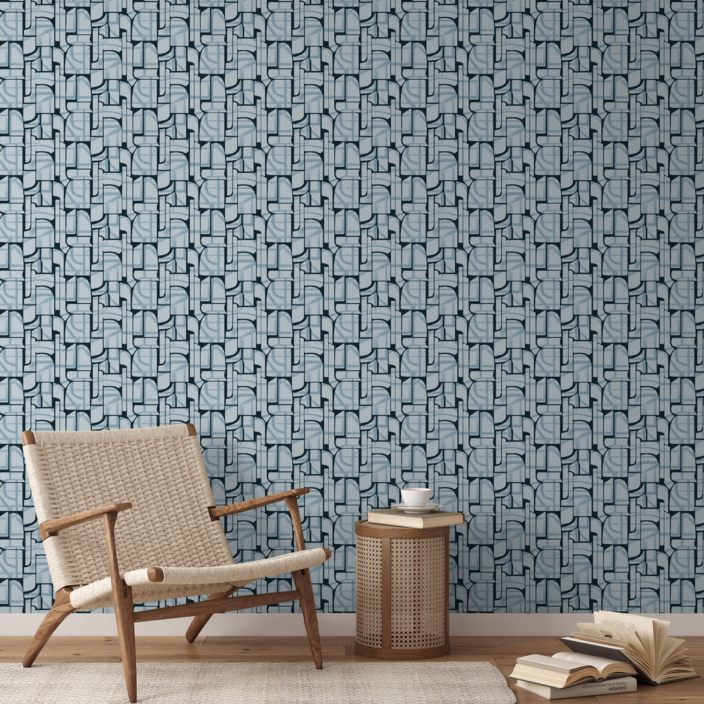 Modern geometric pattern with curved lines and abstract shapes in soft blue and navy tones, creating a contemporary, minimalist aesthetic.