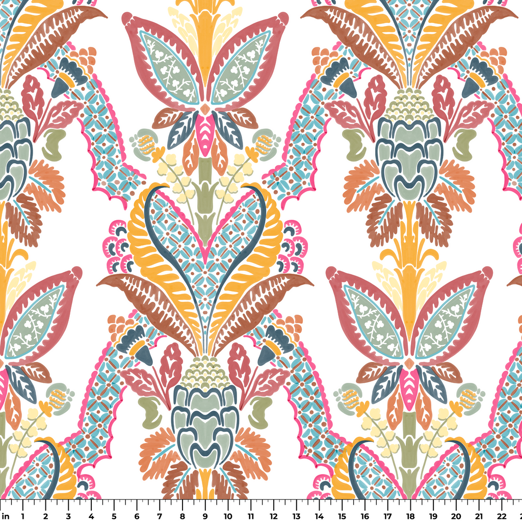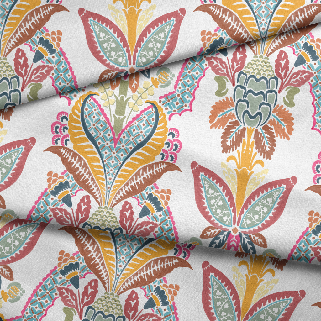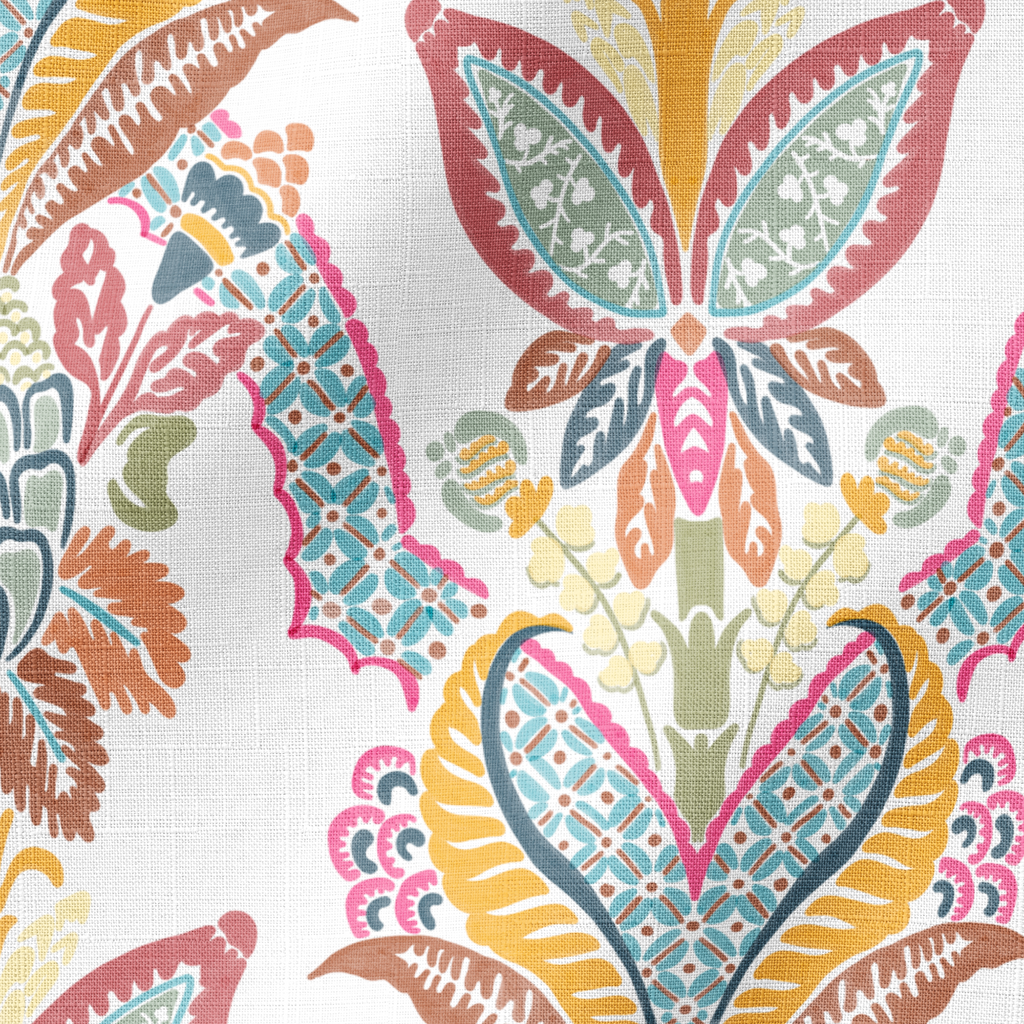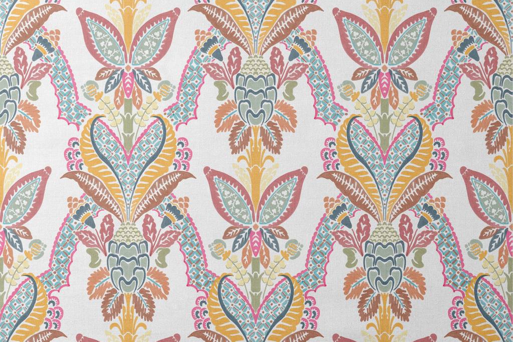 Vibrant paisley and leafy damask pattern in pastel teal, pink, and mustard tones creates an elegant bohemian aesthetic perfect for any home project.