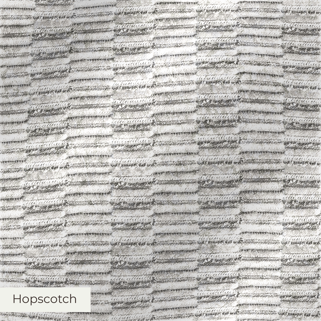 A bold, playful upholstery fabric with raised rectangular accents and subtle sheen. Hopscotch offers a modern architectural feel. Its tactile surface, durability, and design selection make it ideal for statement home decor pieces.