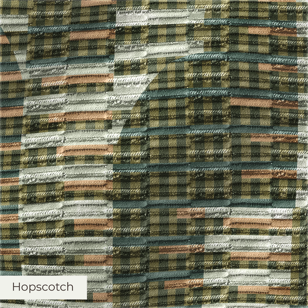 A bold, playful upholstery fabric with raised rectangular accents and subtle sheen. Hopscotch offers a modern architectural feel. Its tactile surface, durability, and design selection make it ideal for statement home decor pieces.
