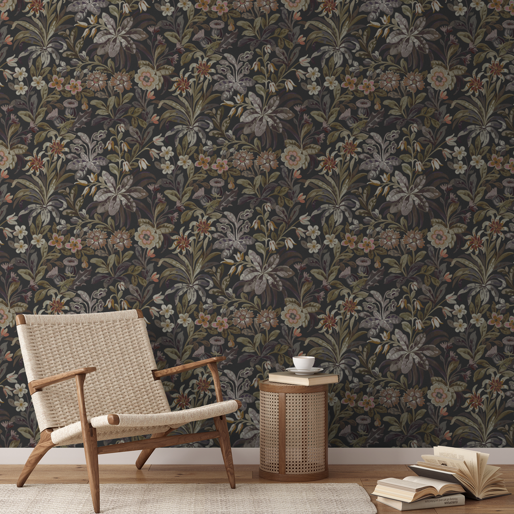 This moody heritage floral wallpaper features lush botanical patterns in earthy tones of olive, cream, and rust against a deep brown background, creating a sophisticated Victorian garden aesthetic.