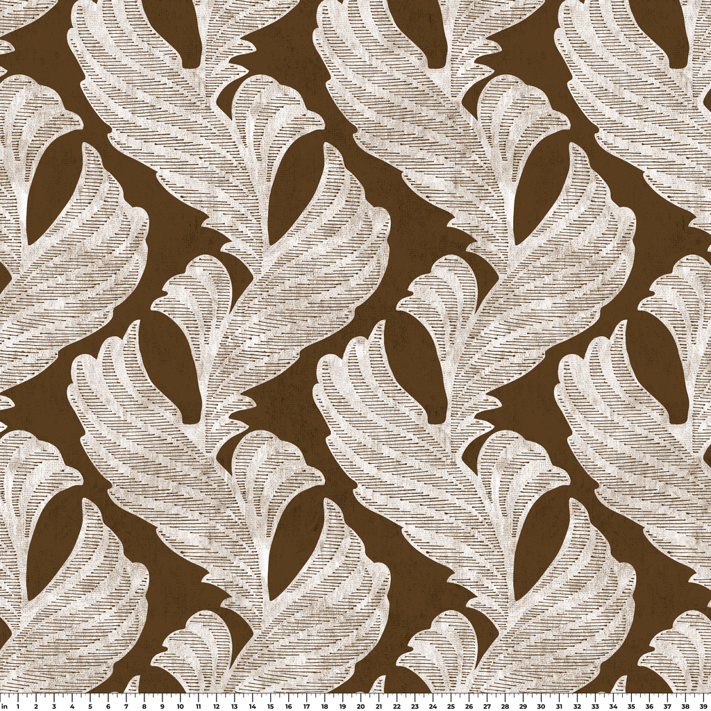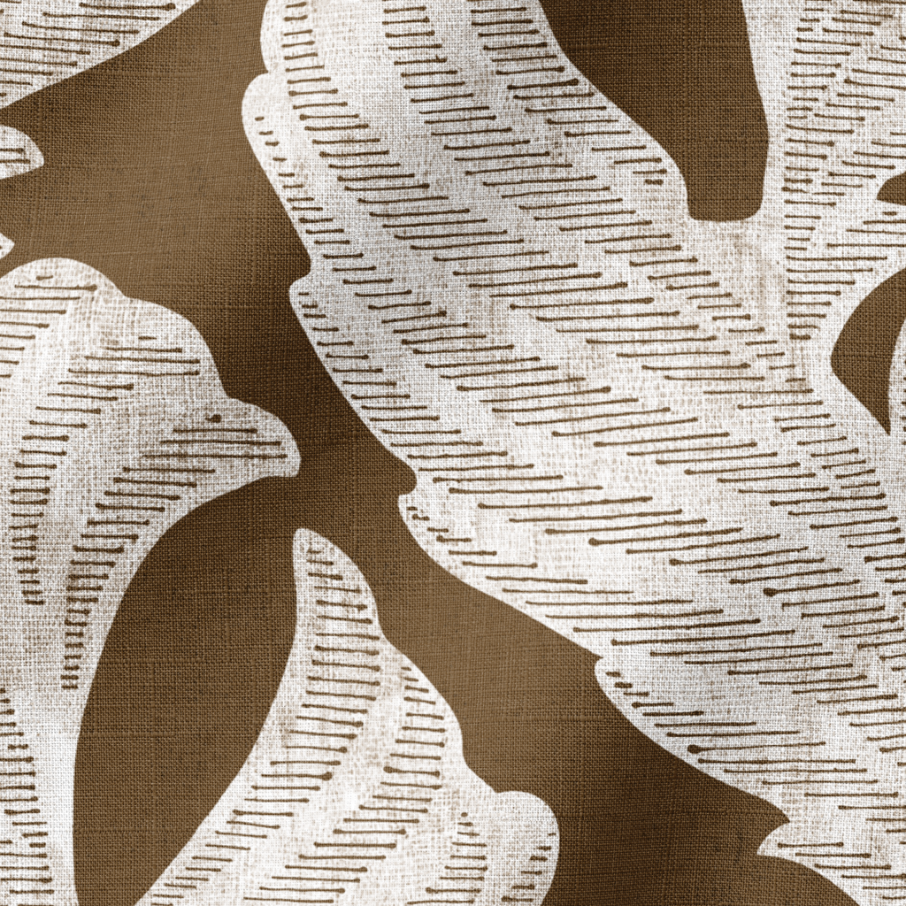 Elegant white foliage pattern on a deep brown background creates a sophisticated, flowing design perfect for contemporary home decor.