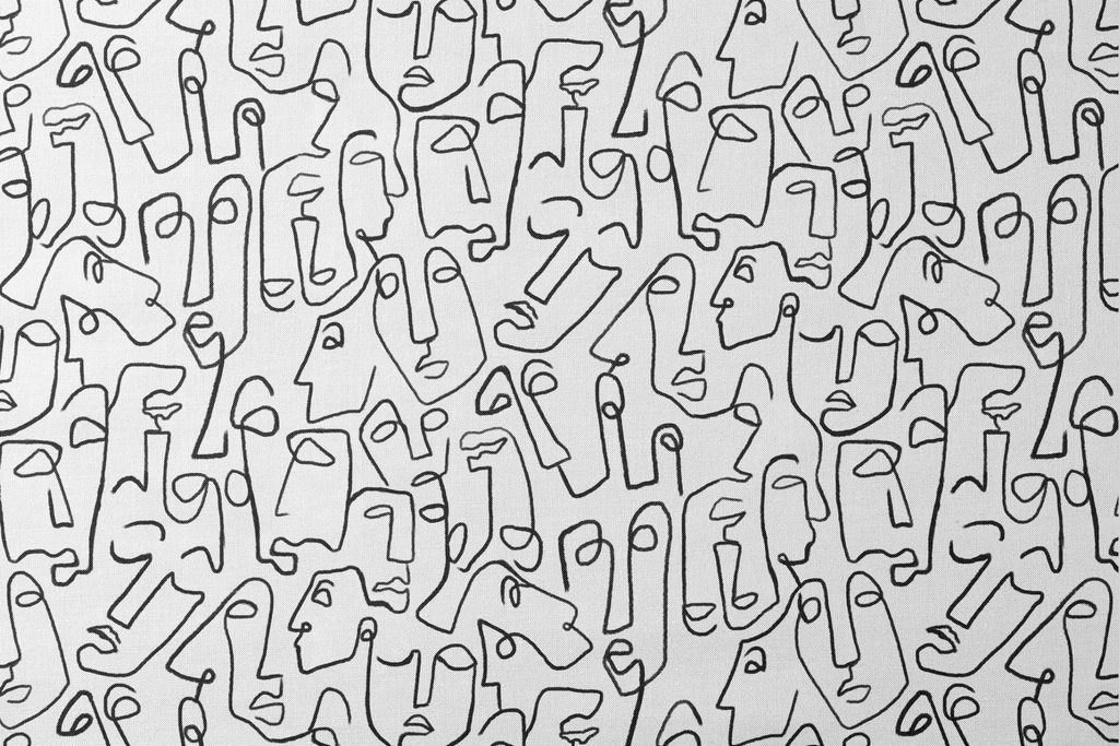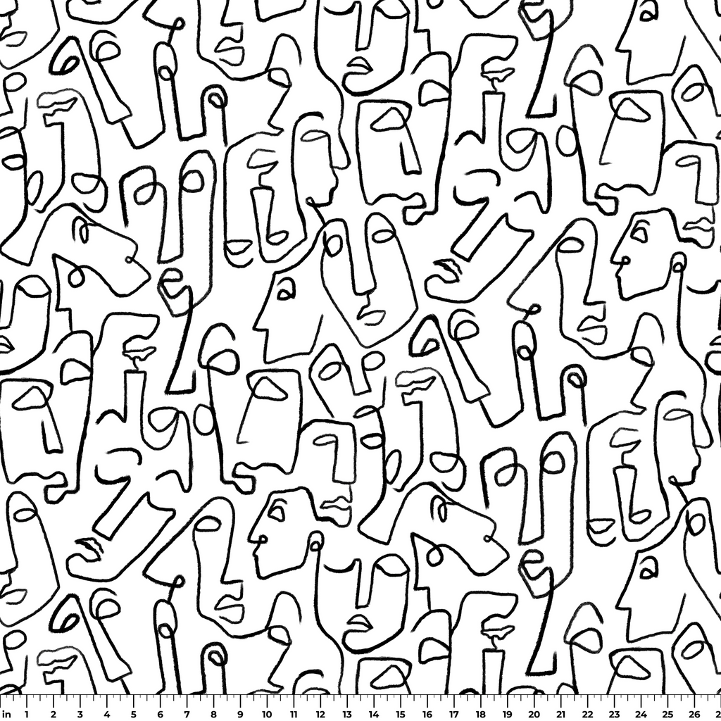 Minimalist line art pattern featuring abstract faces in a continuous, seamless design. Black and white contemporary illustration with organic flowing lines creates a modern, sophisticated aesthetic.