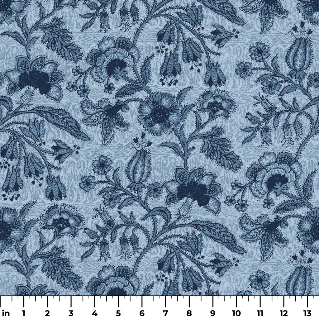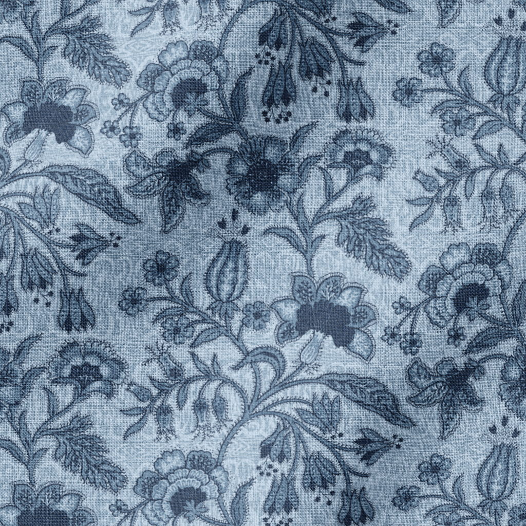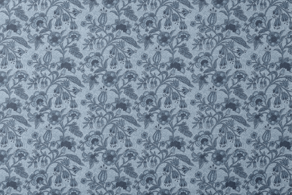 Delicate navy floral pattern on light blue background featuring intricate botanical designs with elegant curved stems and detailed blooms in a classic vintage style. Perfect for giving a delicate touch to any space.