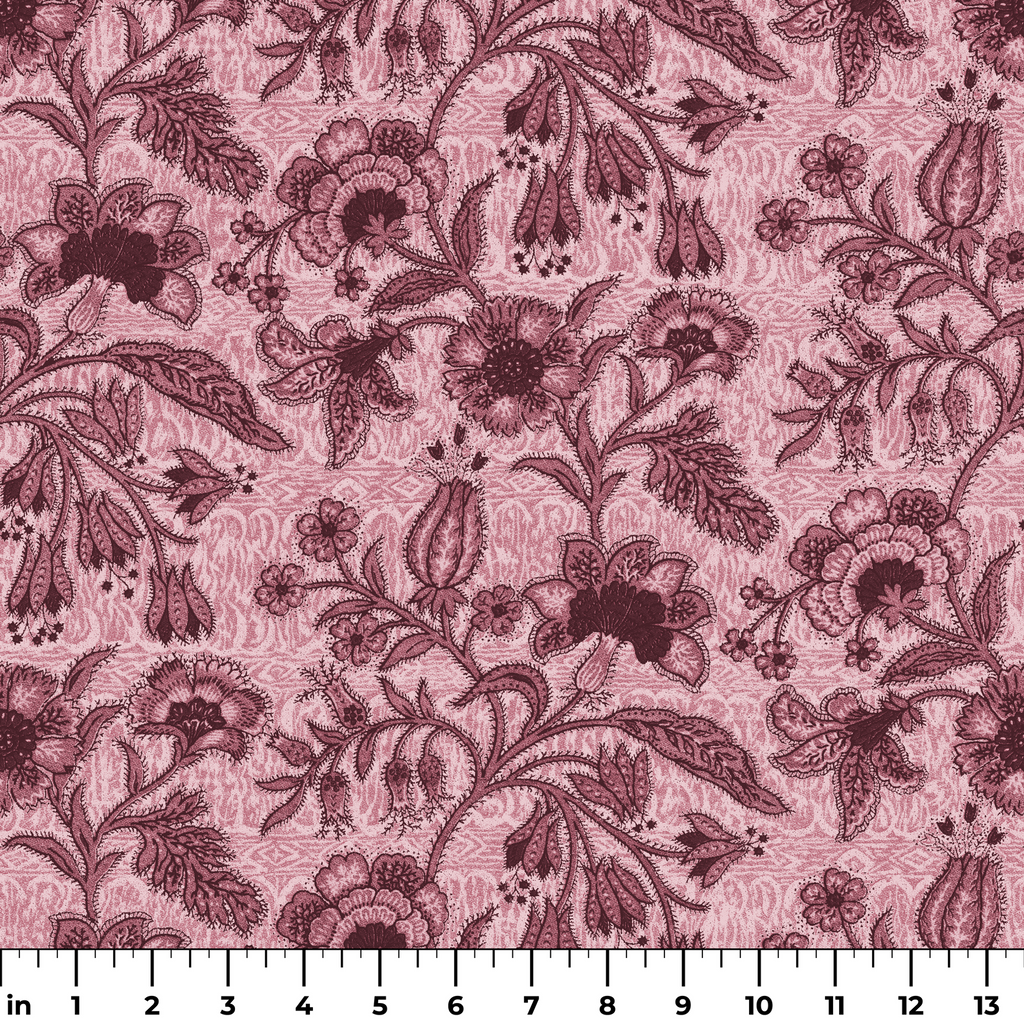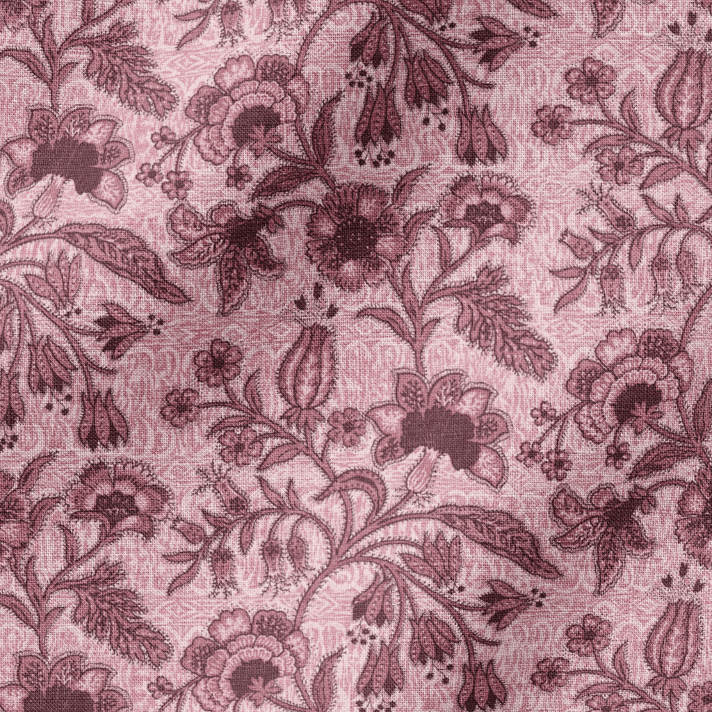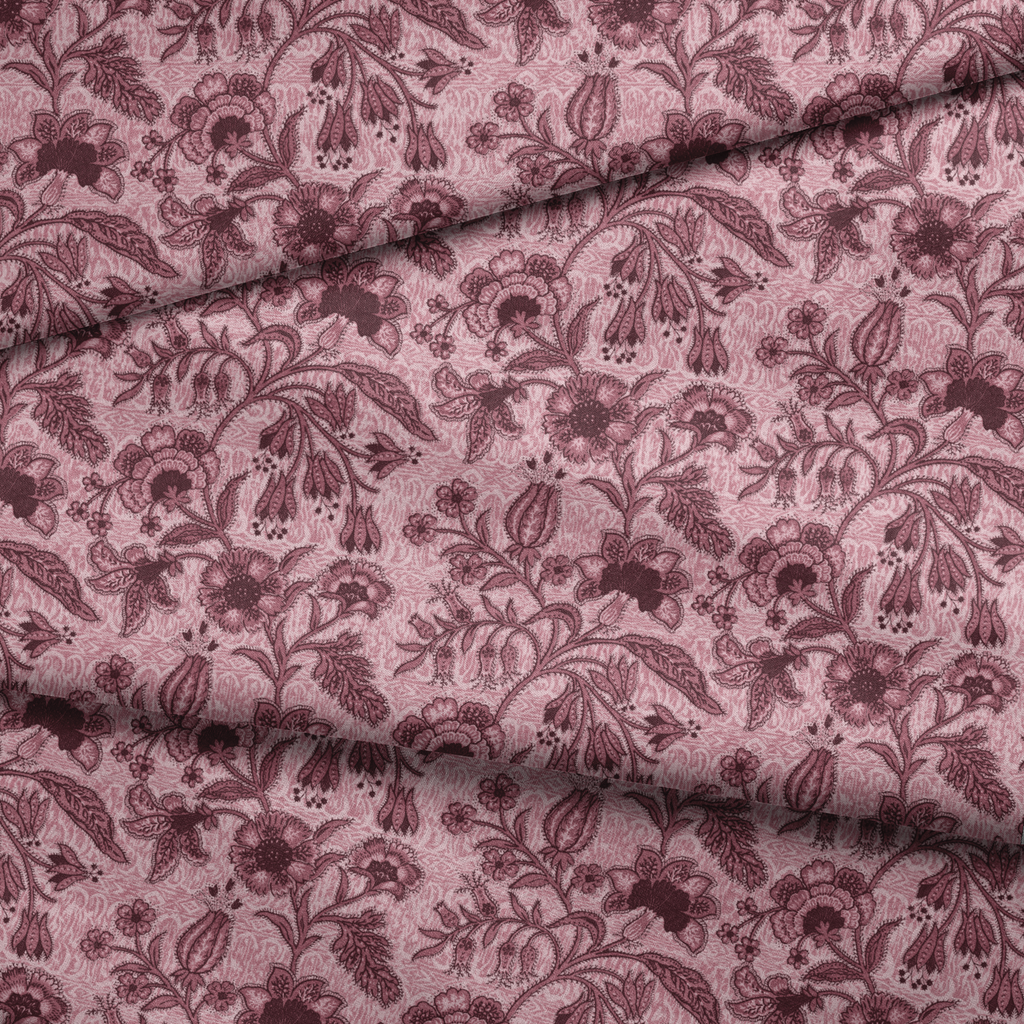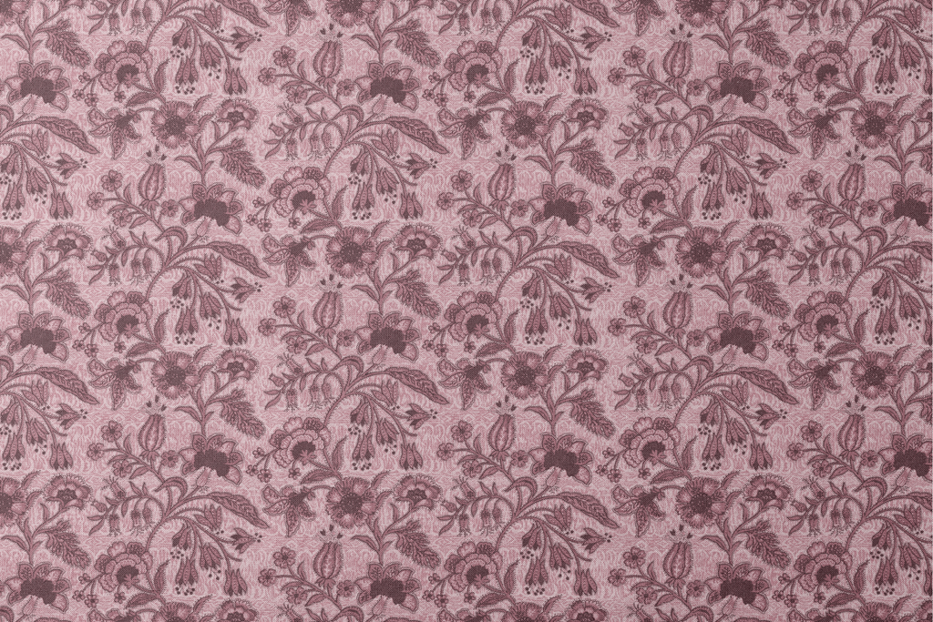 Delicate burgundy floral pattern on light pink background featuring intricate botanical designs with elegant curved stems and detailed blooms in a classic vintage style. Perfect for giving a delicate touch to any space.