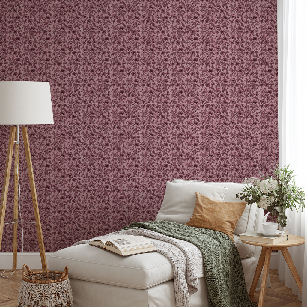 Delicate burgundy floral pattern on light pink background featuring intricate botanical designs with elegant curved stems and detailed blooms in a classic vintage style. Perfect for giving a delicate touch to any space.