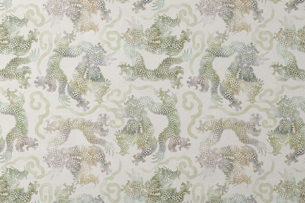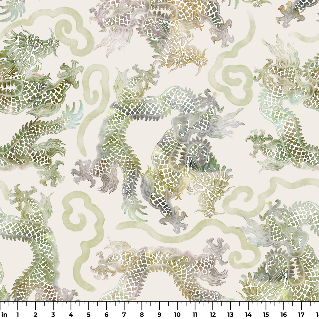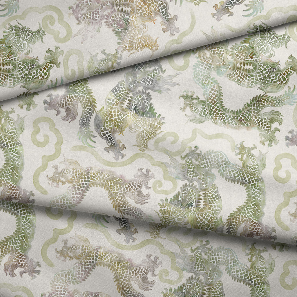 Elegant Asian-inspired pattern featuring stylized dragons in soft green, gray, and gold tones. Traditional motifs blend with flowing clouds and decorative scrollwork for a sophisticated heritage design for any space.