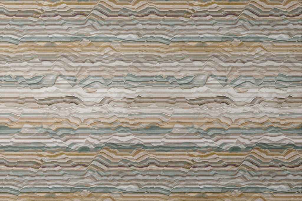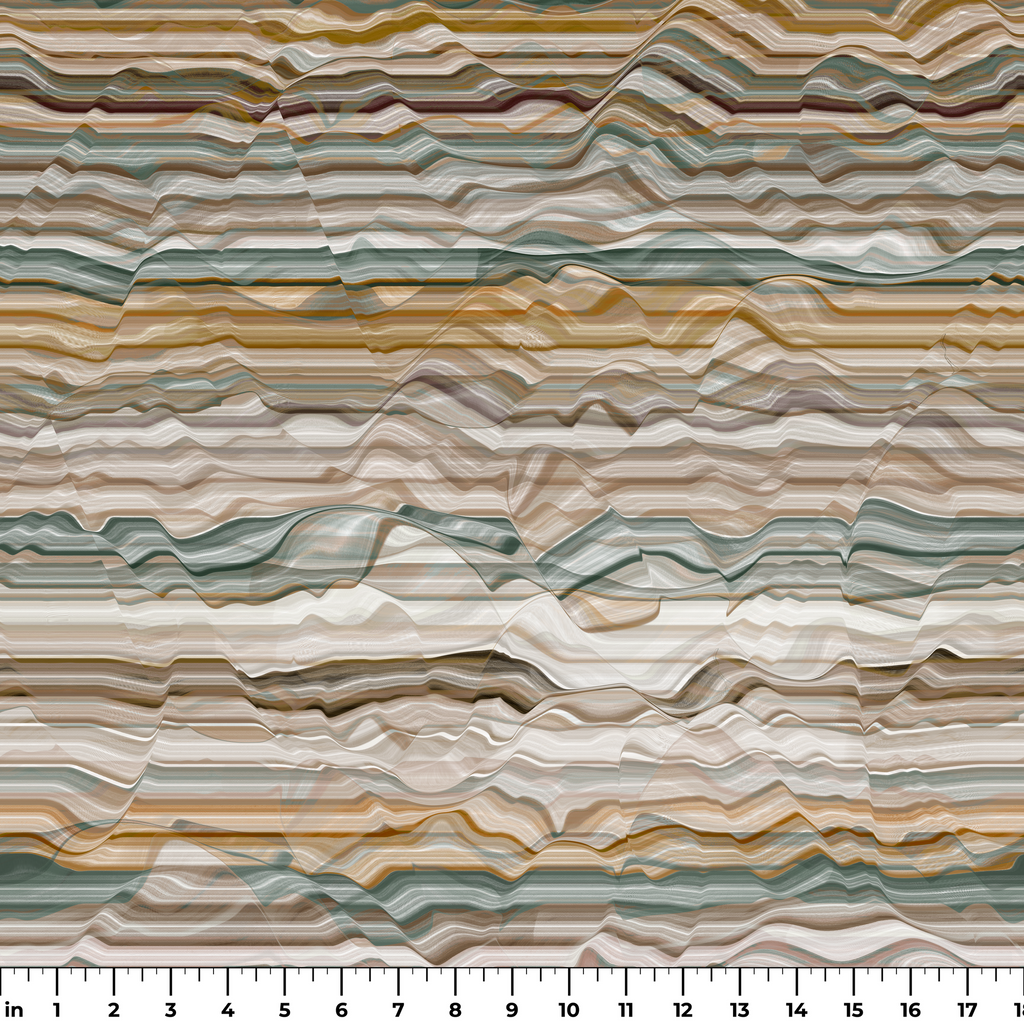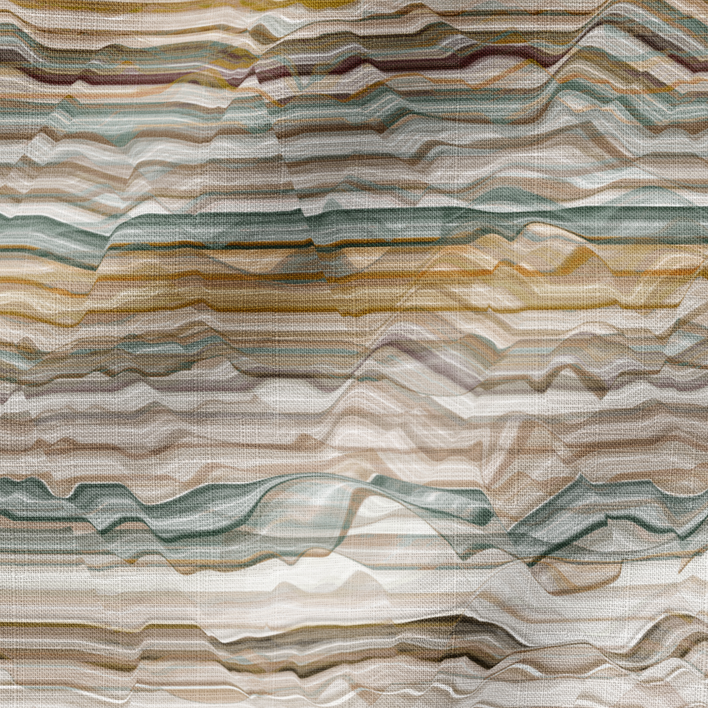 Elegant layered earth tones create a contemporary abstract pattern reminiscent of natural sediment formations. The flowing lines in muted beiges, greens, and golds offer a sophisticated organic texture for modern home decor.