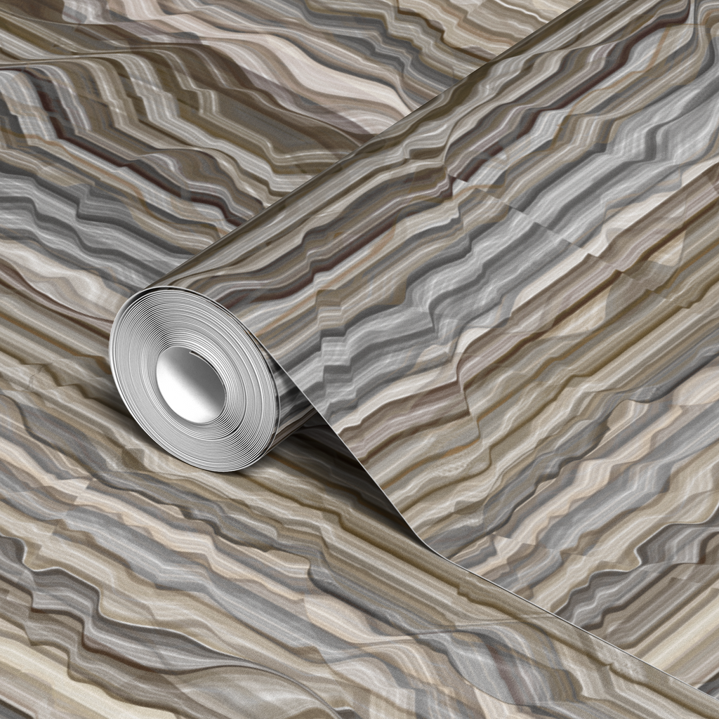 Elegant layered neutral tones create a contemporary abstract pattern reminiscent of natural sediment formations. The flowing lines in muted beige, brown, and gray offer a sophisticated organic texture for modern home decor.
