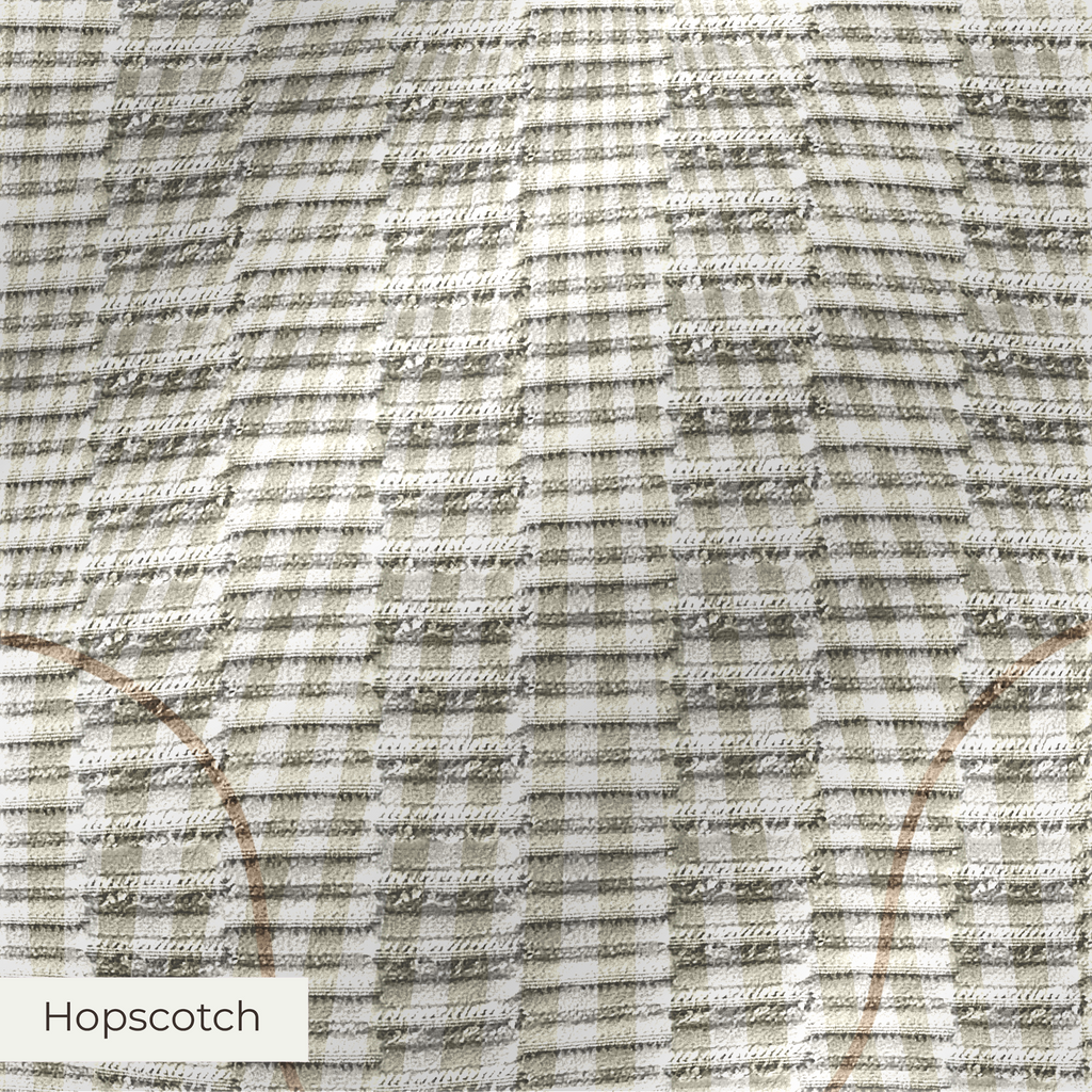 A bold, playful upholstery fabric with raised rectangular accents and subtle sheen. Hopscotch offers a modern architectural feel. Its tactile surface, durability, and design selection make it ideal for statement home decor pieces.