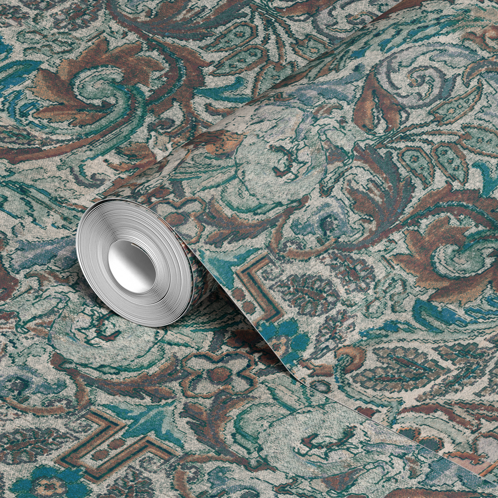 Elegant damask-inspired wallpaper pattern featuring intricate swirls and ornamental flourishes in teal, brown, and turquoise. Rich heritage design with flowing organic forms and textured vintage appeal.