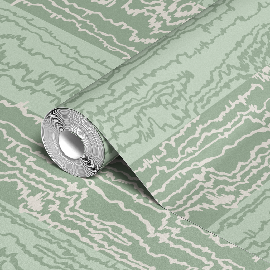 Soft sage green abstract waves create a calming, organic pattern reminiscent of topographic maps or gentle ocean currents. Perfect for contemporary spaces with a natural, minimalist aesthetic.