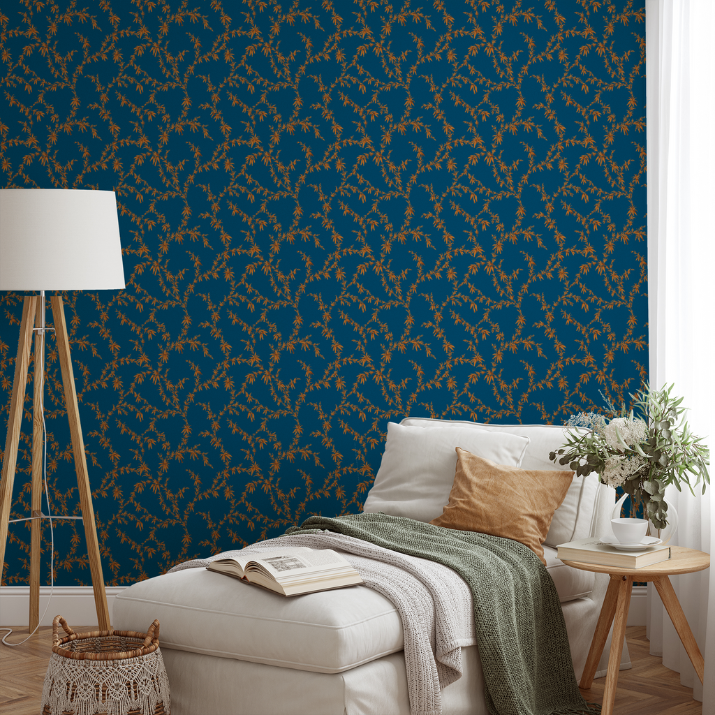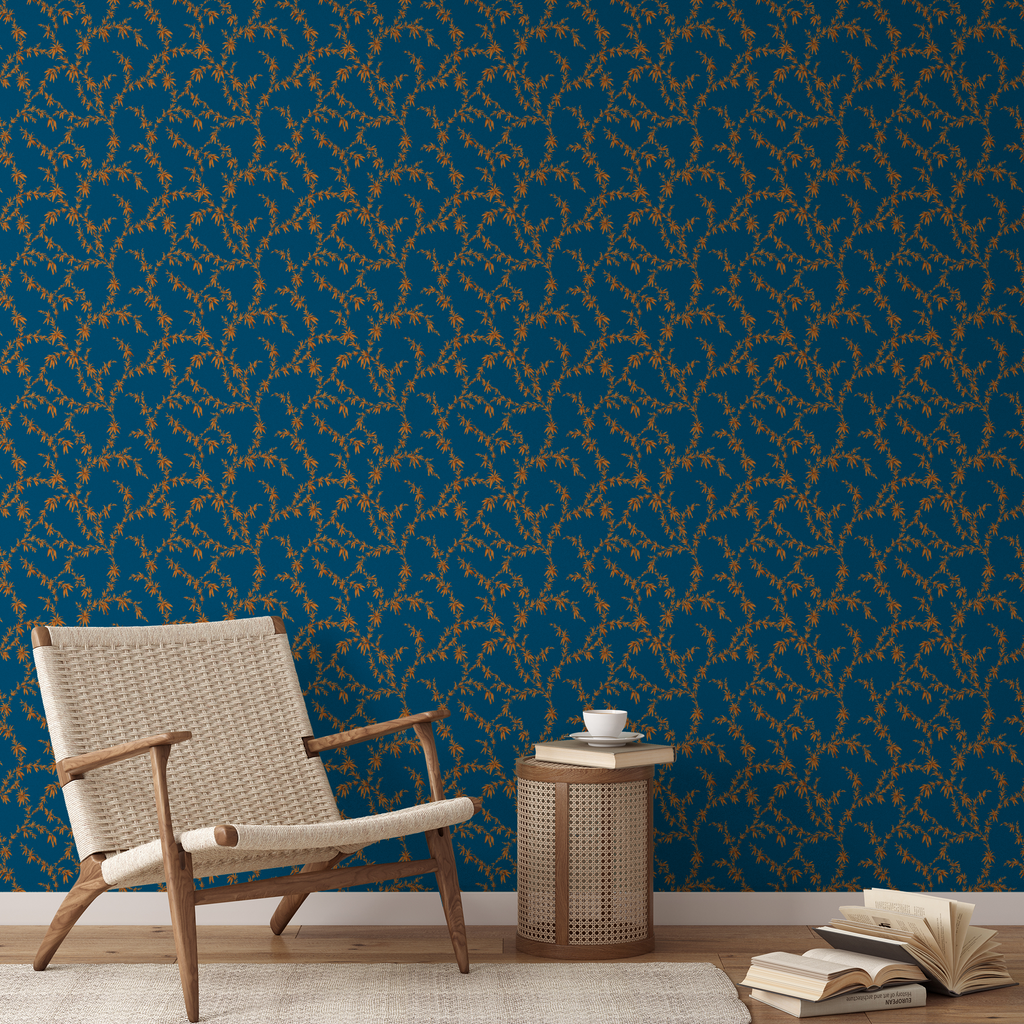 Elegant botanical pattern featuring delicate golden bamboo leaves gracefully flowing across a rich teal background, perfect for contemporary home decor with an Asian-inspired aesthetic.