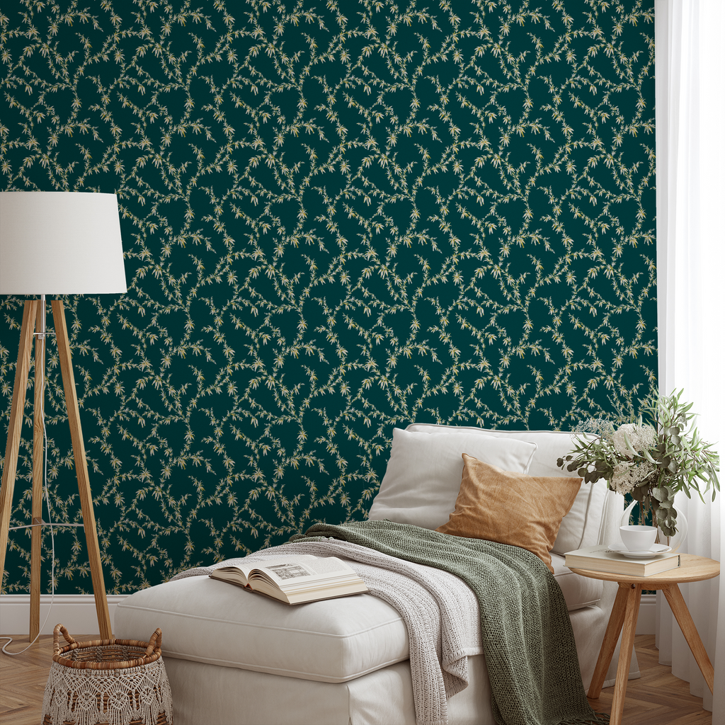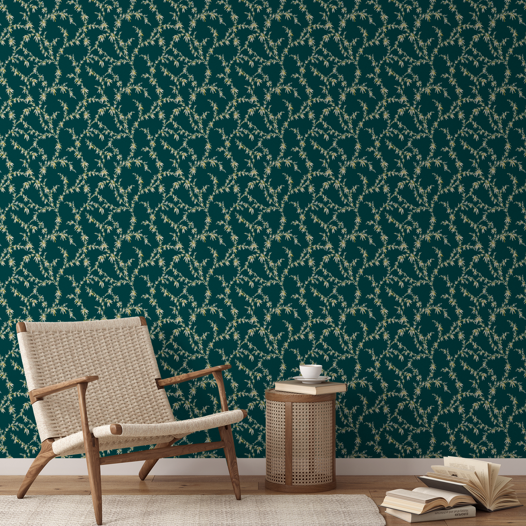 Elegant bamboo branches in creamy beige create a serene, Asian-inspired pattern against a rich teal background. Perfect for home decor with its calming, tropical motif.