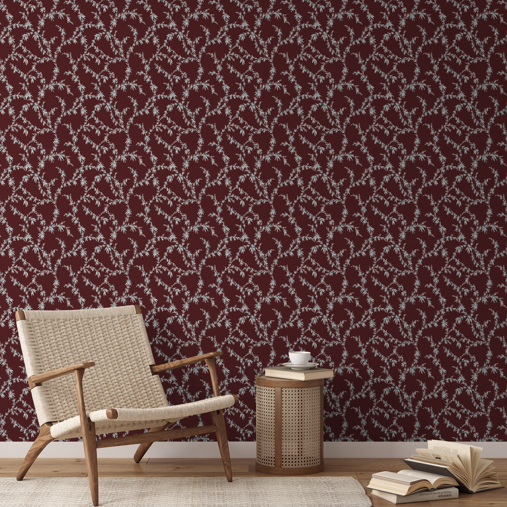 Elegant bamboo-inspired botanical print in a rich burgundy and white colorway. This contemporary Asian-influenced pattern creates a sophisticated natural motif perfect for home decor.