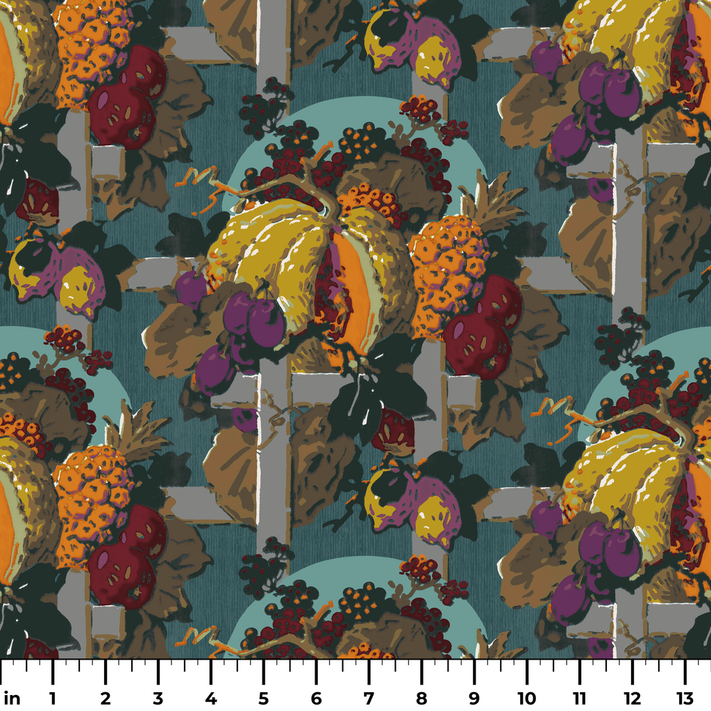This vintage botanical print showcases an array of autumn harvest elements with pumpkins, fruits, and florals in cool earth tones with a orange background.