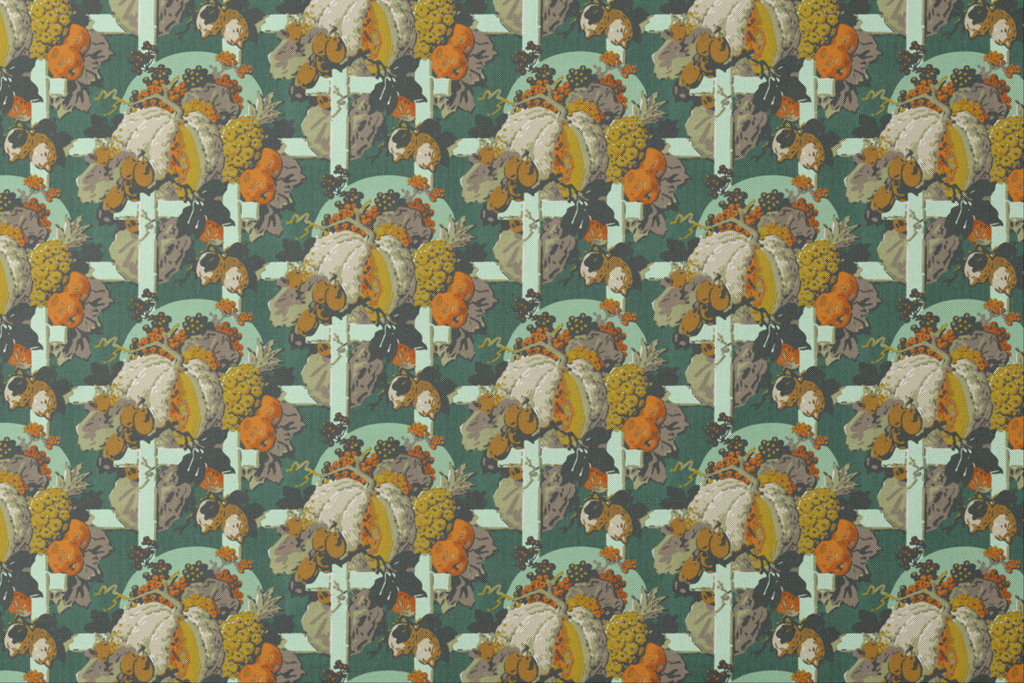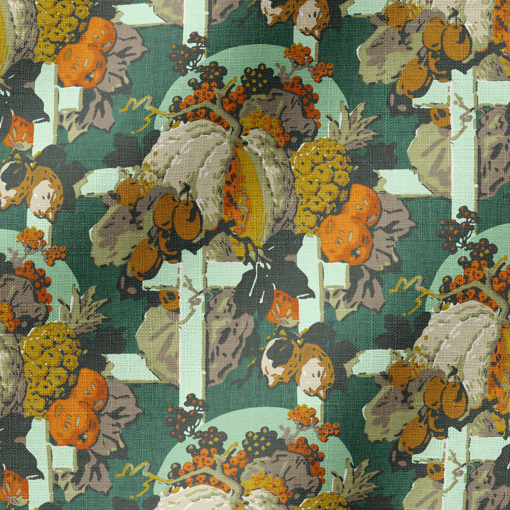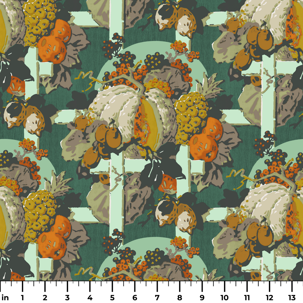 This vintage botanical print showcases an array of autumn harvest elements with pumpkins, fruits, and florals in earth tones with a green background.