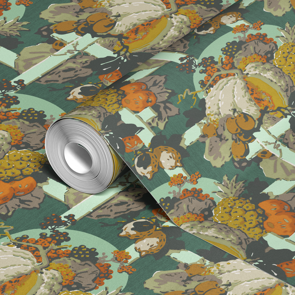 A vibrant retro-inspired fruit cornucopia pattern featuring oranges, melons, grapes, and berries in warm autumnal hues against a teal background. Perfect for kitchen decor.