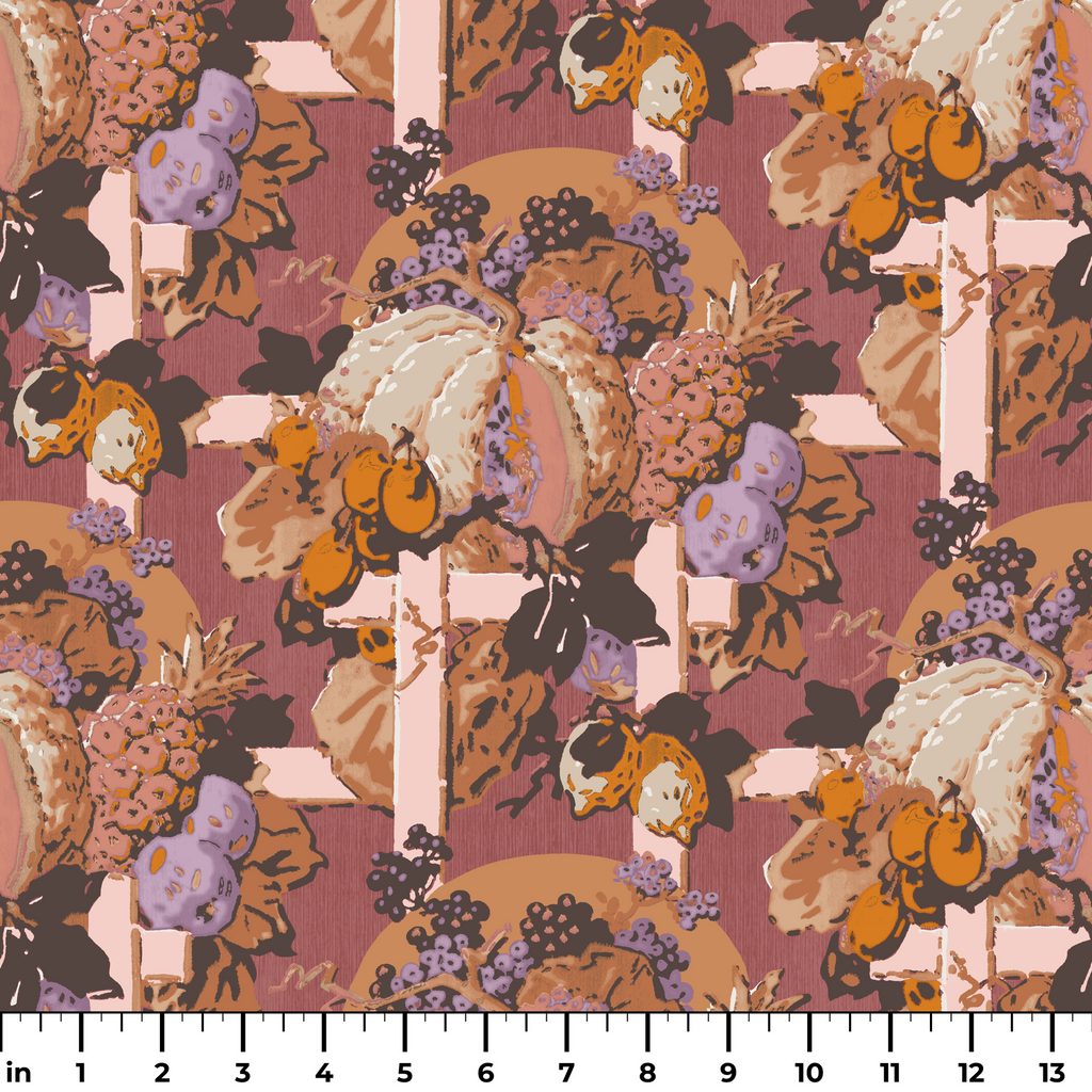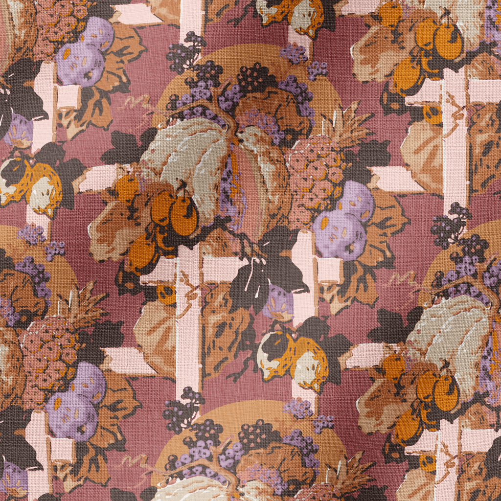 This vintage botanical print showcases an array of autumn harvest elements with pumpkins, fruits, and florals in rich earth tones and muted purples.