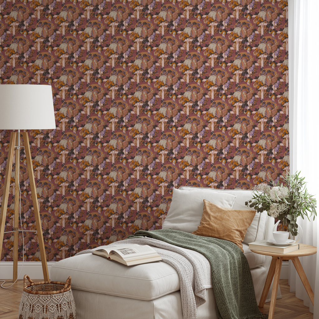 Vintage autumn harvest pattern featuring pumpkins, gourds, and grapes in warm earthy tones of orange, purple, and mauve. Perfect for fall home decor with its traditional seasonal motifs and rich color palette.