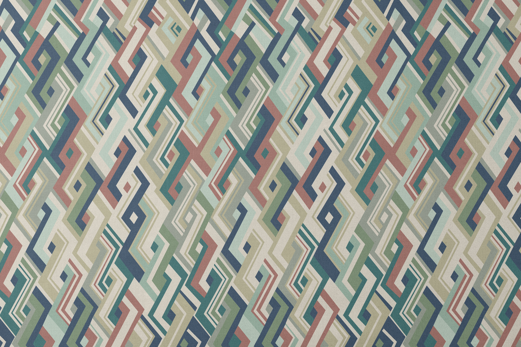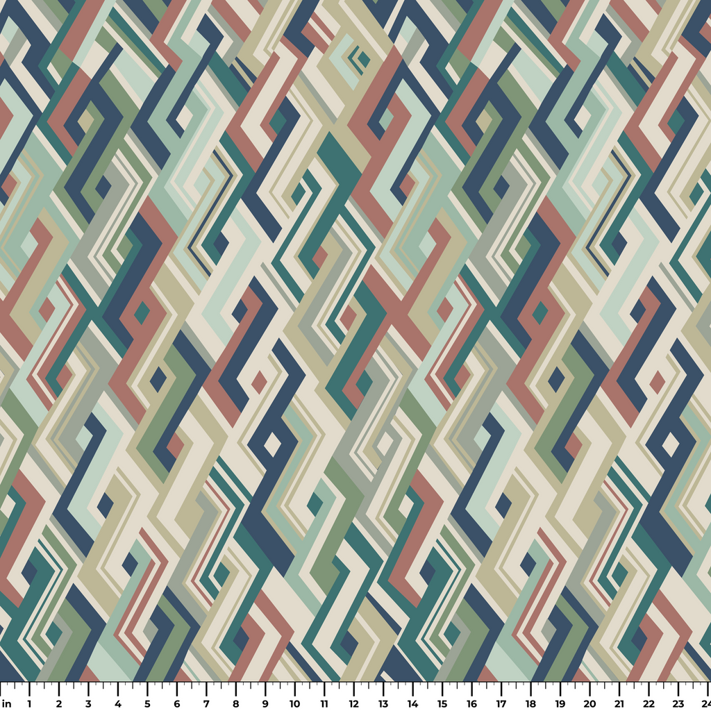 Geometric retro pattern with overlapping diamond shapes in muted teal, cream, coral, and navy creates a dynamic mid-century modern aesthetic perfect for contemporary home decor.