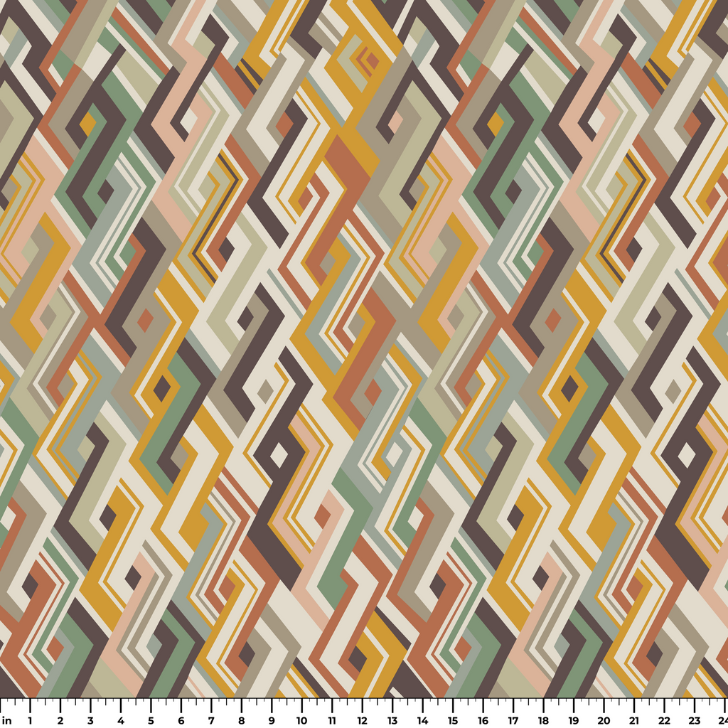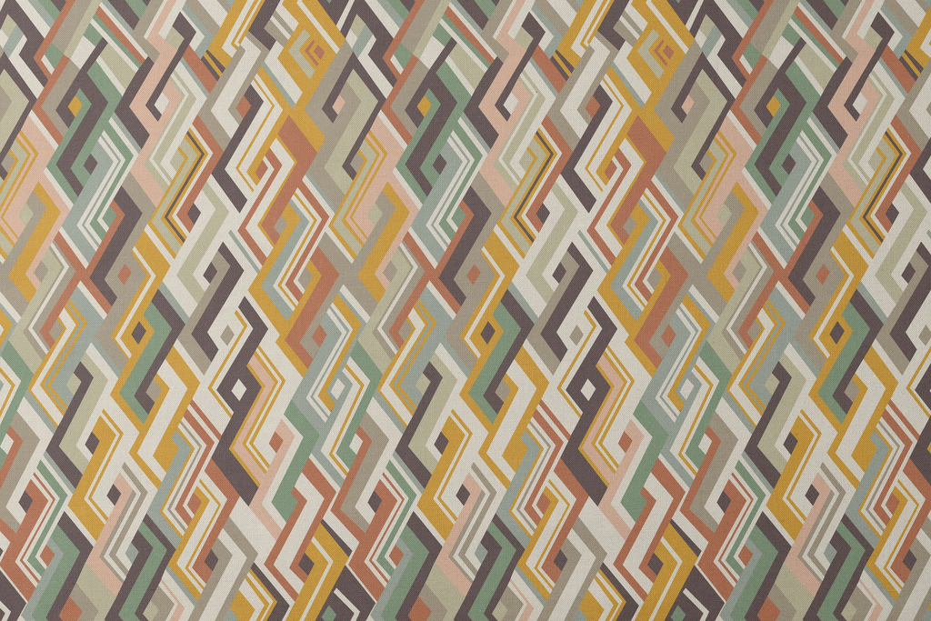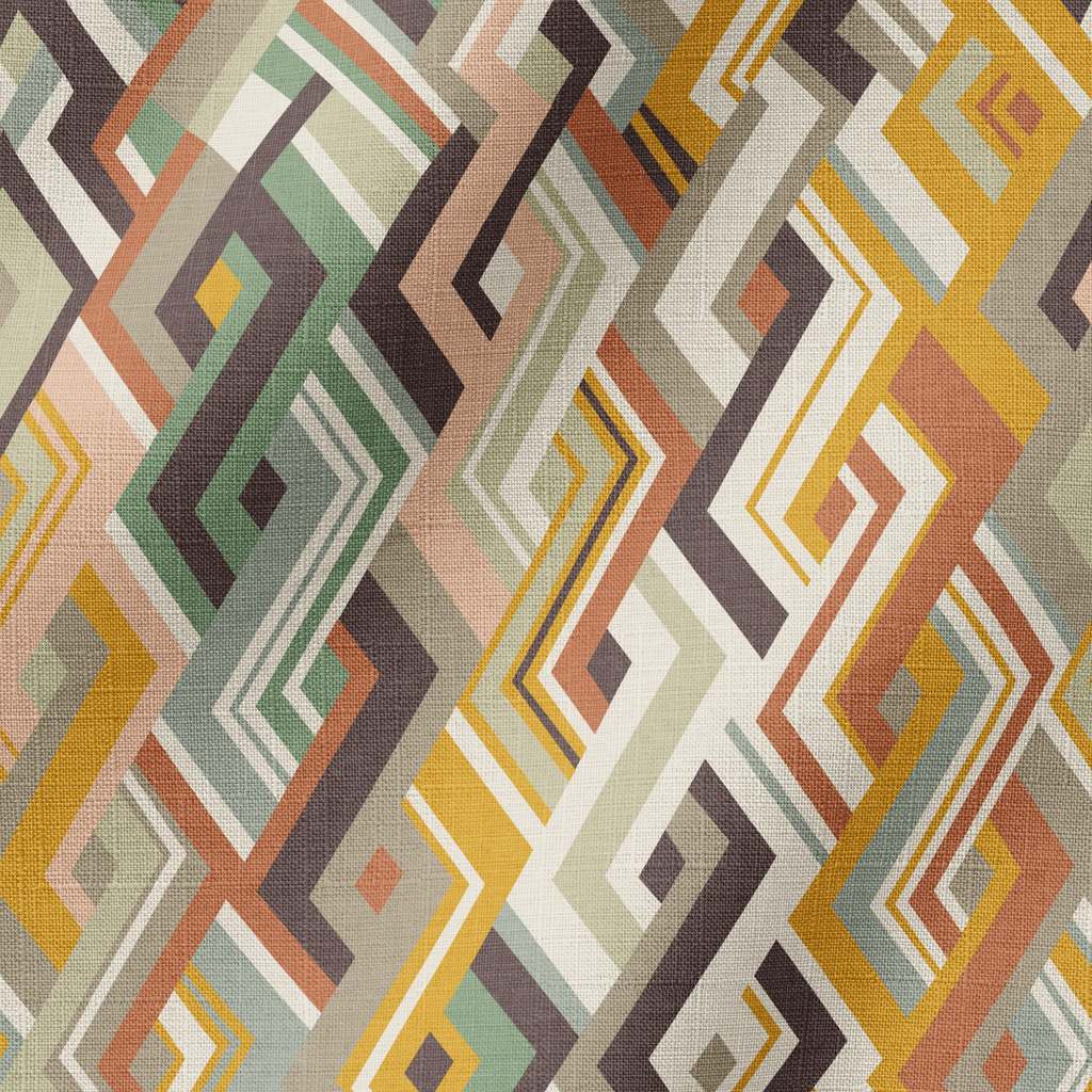 Sophisticated geometric pattern featuring warm mustard, sage, and burgundy tones in a retro mid-century design with overlapping diamond shapes and angular lines.