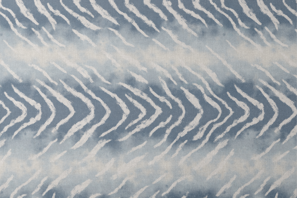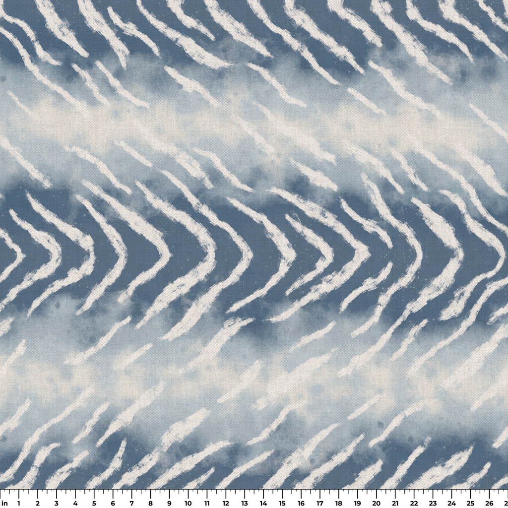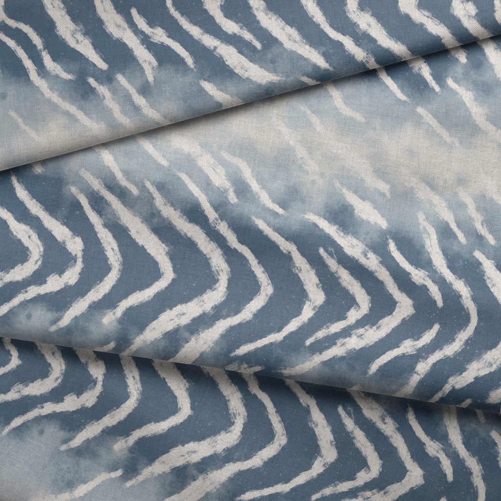 Sleek geometric pattern in blue and white tones with flowing wavy lines creating a dynamic chevron effect. Perfect for contemporary home decor or stylish apparel.