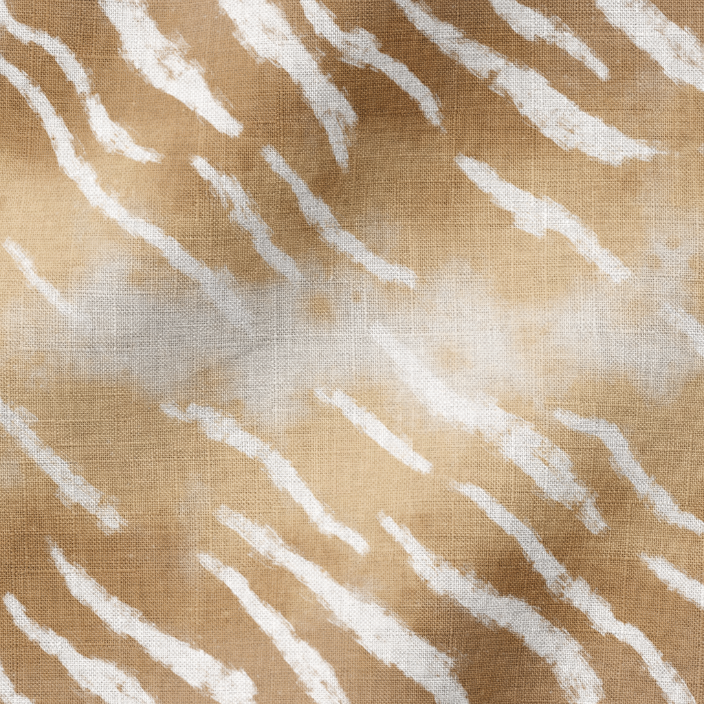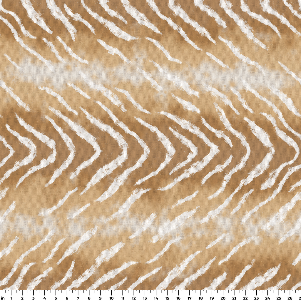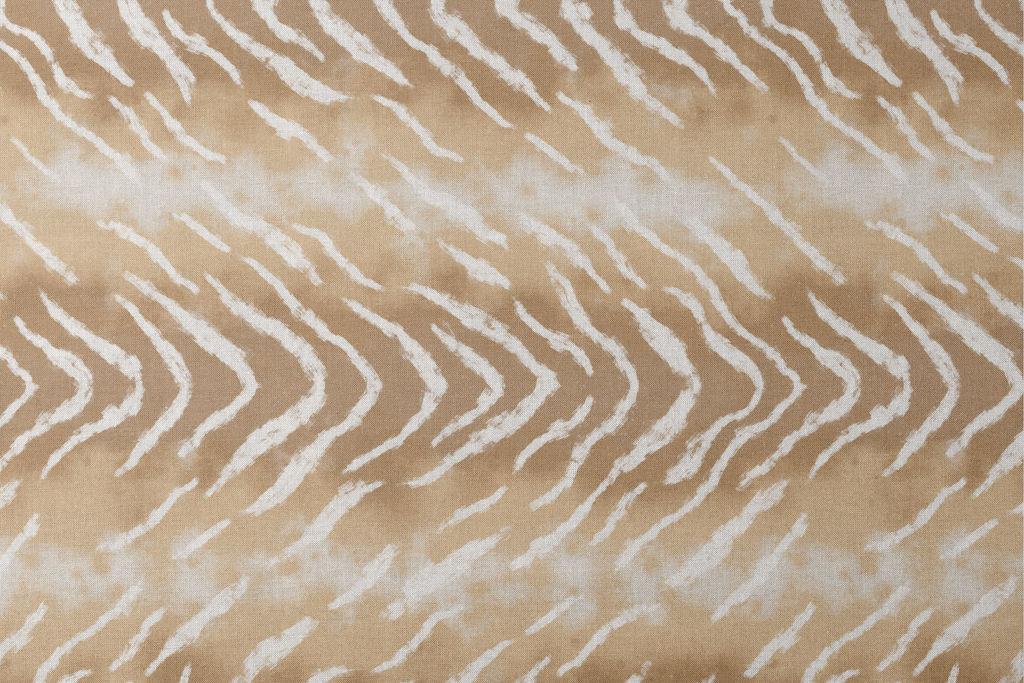 Sleek geometric pattern in tan, beige, and white tones with flowing wavy lines creating a dynamic chevron effect. Perfect for contemporary home decor or stylish apparel.